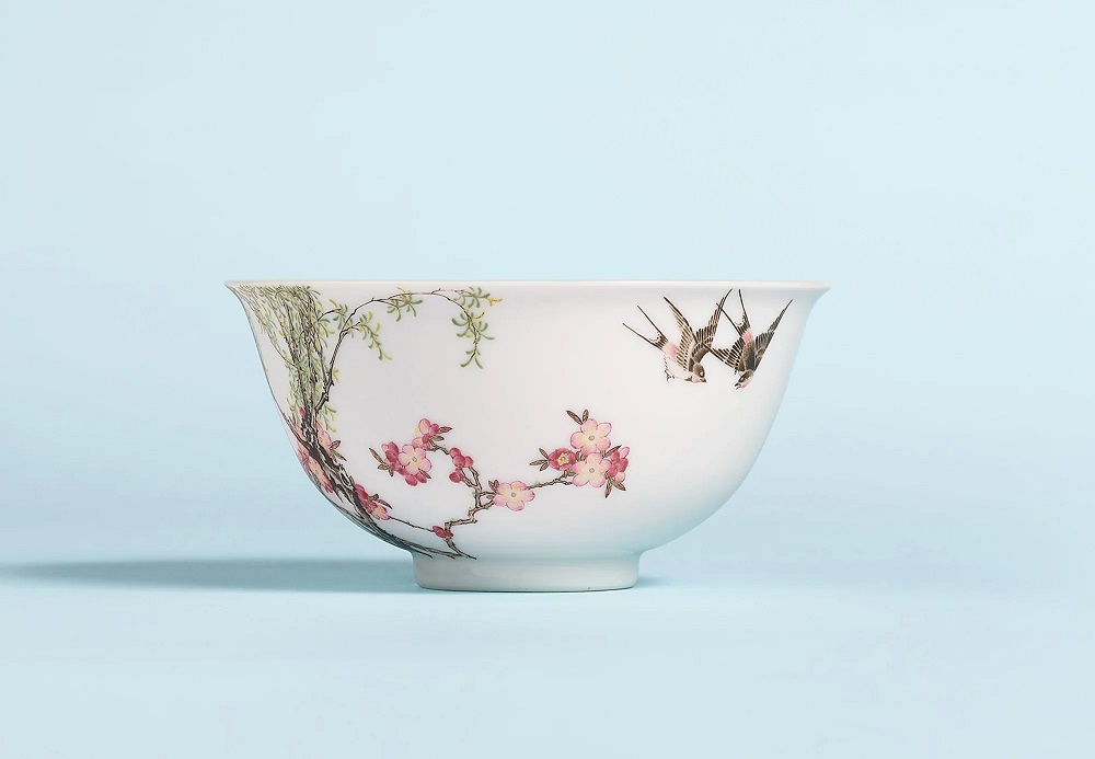 Được bán với giá 198,2 triệu đô la Hồng Kông (25,3 triệu USD), chiếc bát có hình hai con én, một cây mai đang nở hoa và một cây liễu. Trong danh mục đấu giá, chuyên gia gốm sứ Regina Krahl cho biết, họa tiết chim và hoa rất phổ biến vào thời Ung Chính. Cô cũng mô tả chiếc bát này nằm trong một nhóm nhỏ các đồ vật đại diện cho “đỉnh cao của hội họa trên đồ sứ”.