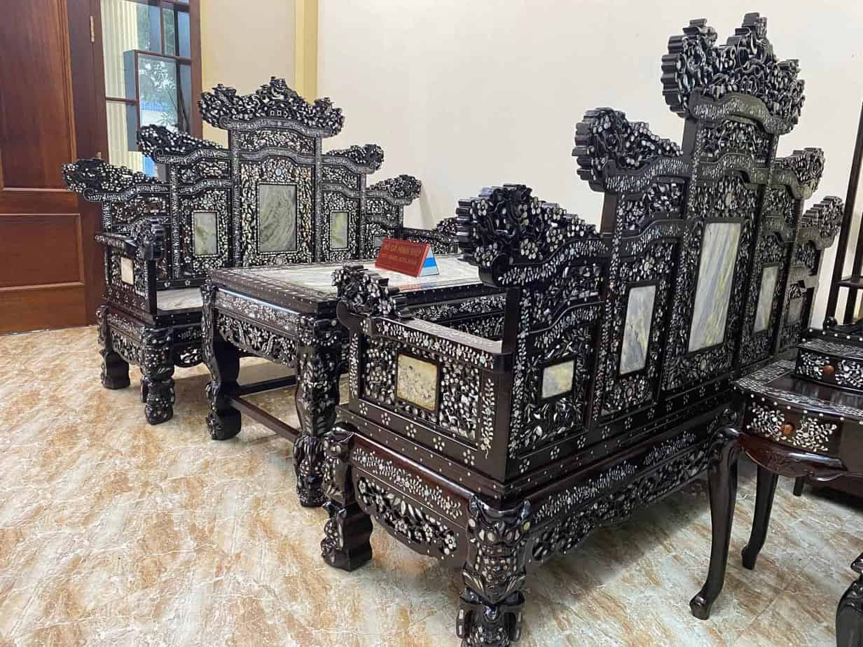 - Bộ bàn ghế cổ: Bộ bàn ghế được làm từ gỗ trắc, gỗ hương, khảm ốc tinh xảo.